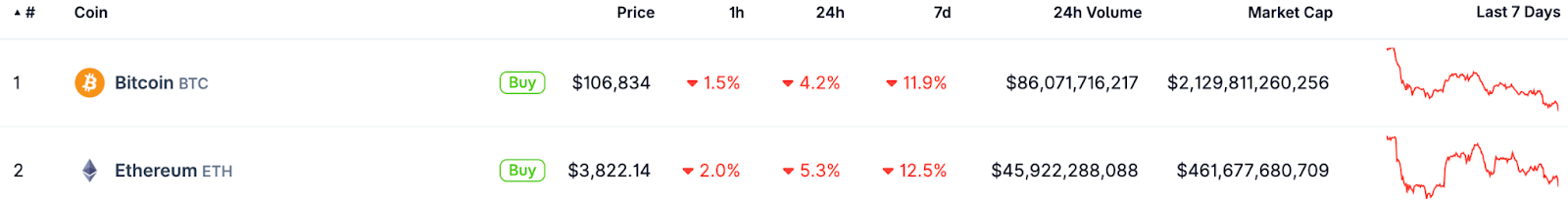 According to CoinGecko data, ETH fell below $4,000, and is currently at $3,822.14, marking a 12.5% decrease over 7 days. BTC is now quoted at $106,834, with an 11.9% decrease over 7 days.