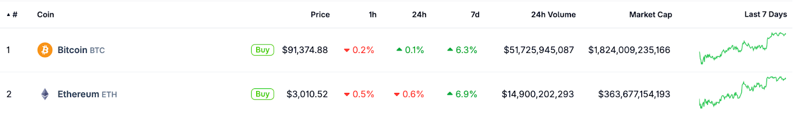 After last week's significant market decline, BTC briefly fell below $90,000 and ETH dropped below $3,000. This week, the crypto market has rebounded, with both having recovered. BTC is quoted at $91,374.88, up 6.3% over 7 days, and ETH is quoted at $3,010.52, up 6.9% over 7 days.