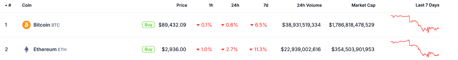 Within the week, BTC briefly broke above $95,000 but is now quoted at $89,432.09, a 7-day decline of 6.5%. ETH rose as high as $3,300 before falling to its current price of $2,936.00, down 11.3% over 7 days. Meanwhile, as safe-haven demand intensified, gold and silver continued to hit new highs; XAUt broke past $4,900 and is currently quoted at $4,952.08.