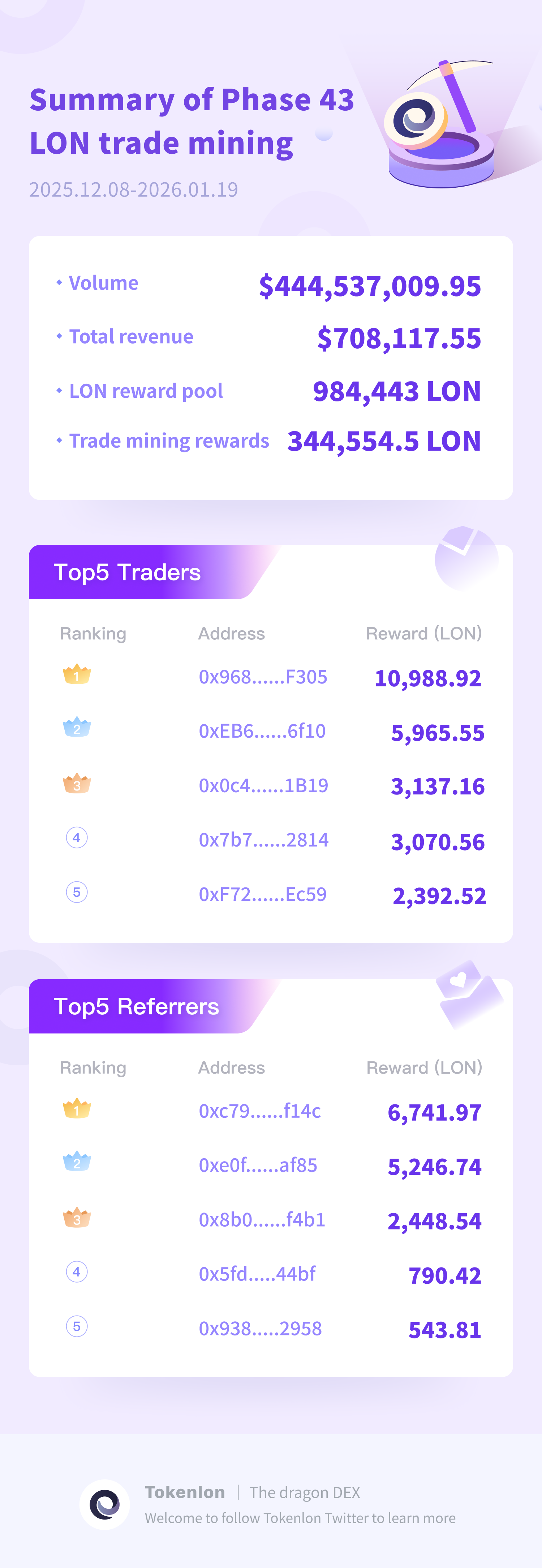 Tokenlon completed phase 43 of LON trade mining on 19th Jan 2026 (UTC+8), with a total volume of $444,537,009.95 and the revenue was $708,117.55. The total LON rewards amounted to 984,443 LON. Based on the TIP40 proposal, 35% of which were distributed as rewards for trade mining, which totals to 344,554.5 LON . The full distribution can be found below: