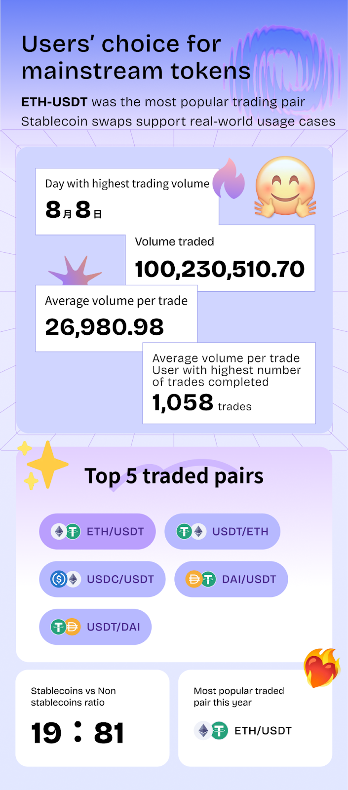 Regarding trading pairs, ETH–USDT emerged as the most popular. The top 5 pairs all consisted of BTC/ETH mainstream tokens + stablecoins, fitting the 2025 market trend of rising volume in mainstream tokens on DEXs. The asset structure remained healthy and balanced: non-stablecoin trades accounted for 81%, while stablecoins accounted for 19%. Stablecoins continue to serve as a reliable medium for mainstream trading demand, helping the protocol avoid liquidity risks associated with an over-reliance on altcoins—a strategy perfectly aligned with Tokenlon's focus on robust, mainstream growth.