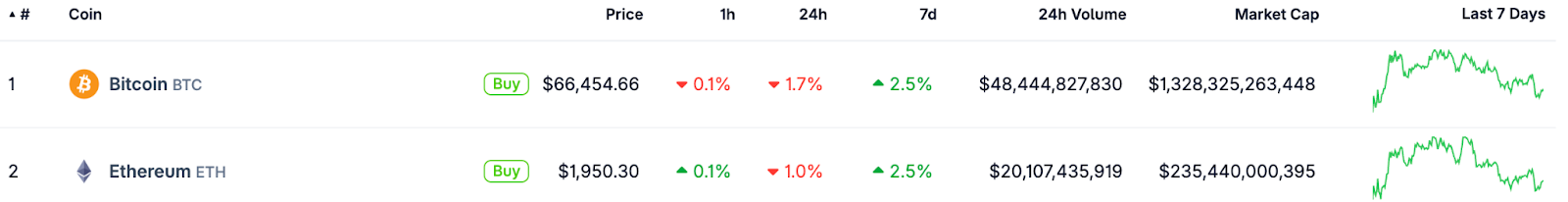 Regarding mainstream tokens, BTC fell below $70,000 again this week and is currently quoted at $66,454.66, a 7-day increase of 2.5%; ETH is currently quoted at $1,950, also up 2.5% over the past 7 days.