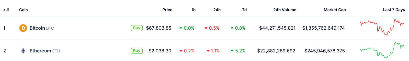 BTC briefly broke above $68,000 and is currently quoted at $67,803.85, a slight 7-day increase of 0.8%. ETH has returned above the $2,000 mark, currently quoted at $2,038.30, up 5.2% over the past 7 days.