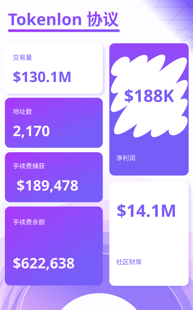- Tokenlon 本周交易量为 $130,127,018.15,交易地址数 2,170,交易笔数 5,244;手续费捕获 $189,478.80,手续费净利润为 $188,053.18,当前手续费余额 $622,638.48,社区财库总额 $14,186,159.95。