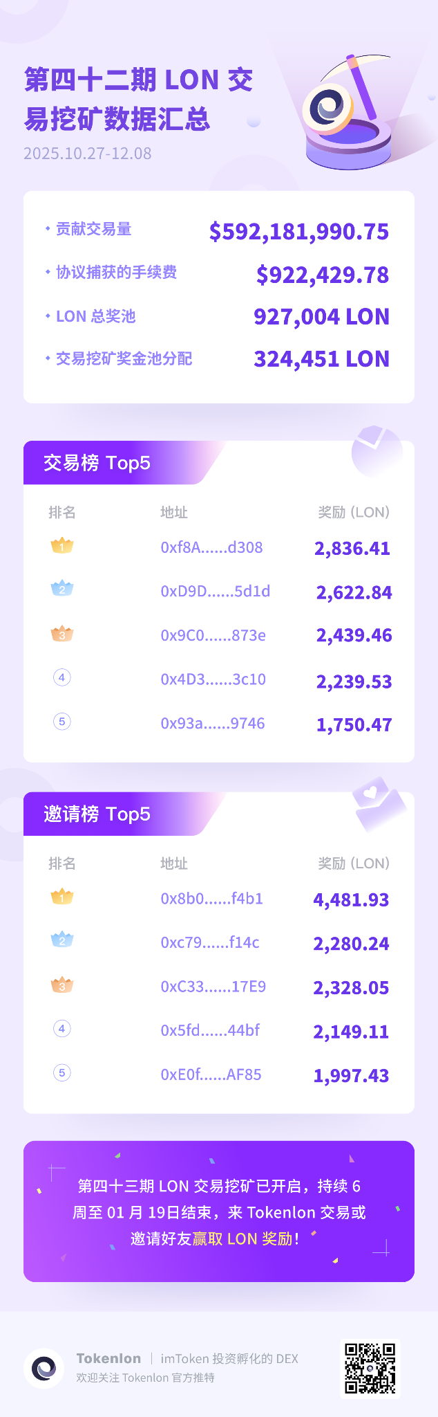 Tokenlon 已于 2025 年 12 月 08 日 16:00 (UTC+8) 完成了第四十二期交易挖矿奖励分配,本期贡献交易量为 $592,181,990.75,协议捕获的手续费为 $922,429.78,LON 总奖池为 927,004 个 LON。根据 TIP 40 提案的投票结果,35% 分配给交易挖矿奖金池 324,451 个 LON,具体情况如下: