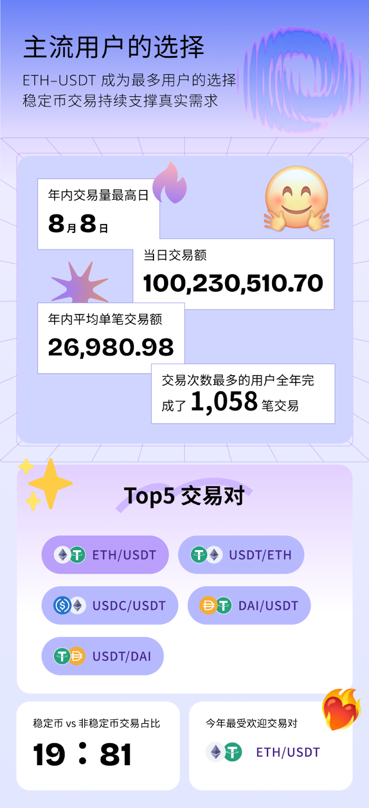 交易对表现上,ETH–USDT成为最热门交易对,Top 5 交易对均属于「BTC/ETH 蓝筹资产+稳定币」的经典组合,贴合 2025 年 DEX 赛道主流资产交易占比攀升的行业趋势。资产结构保持健康均衡:非稳定币交易占比 81%,稳定币占比 19%。稳定币持续发挥可靠交易媒介作用,支撑蓝筹资产长期交易需求,规避过度依赖长尾代币带来的流动性波动风险,与 Tokenlon 深耕主流交易对、稳健发展的定位高度契合。