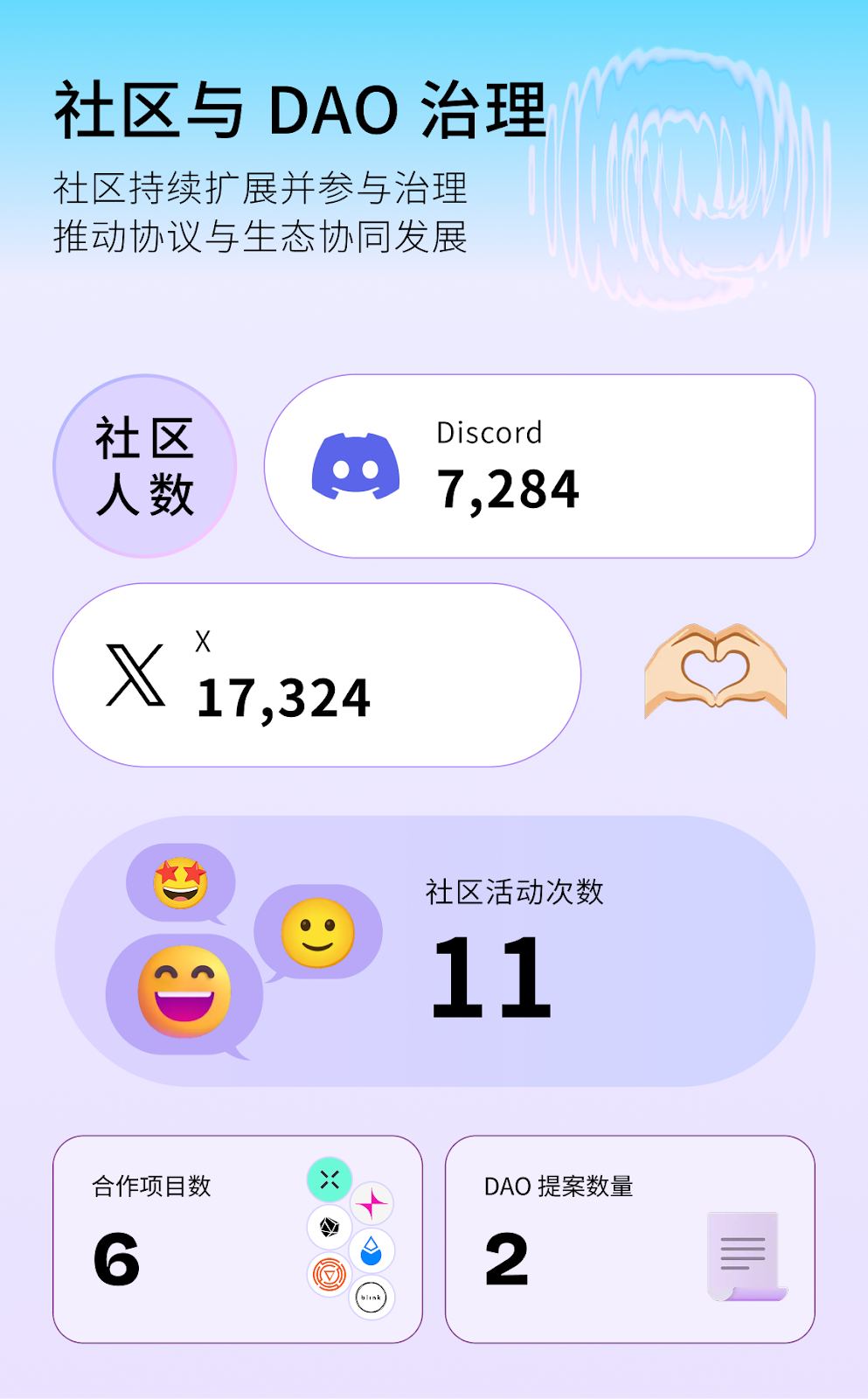 全年累计举办11场社区活动,深度联动用户参与生态建设,成功落地 6 个合作项目、扩容生态矩阵;同时发起 2 项 TIP 提案,逐步将协议发展与决策权利交还给社区,充分践行去中心化治理理念。这一过程中,社区在协议迭代、生态扩容中的共建力量得以凸显,为 DAO 去中心化治理筑牢根基。