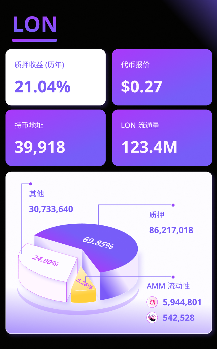 - LON staking 合约质押量为 86,217,017.53 个 LON,自 LON 质押 2021 年 4 月 1 日上线以来,历史累计收益率为 21.04%(供参考);LON 流动性池主网与 Arbitrum 网络(Uniswap+Sushiswap),其中 LON 锁仓量为 6,487,329 LON,LON 当前报价 $0.27。