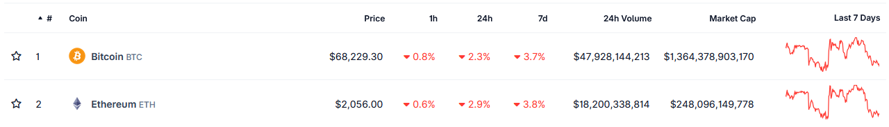 加密市场在周初一度受避险资金挤压跌破 $69,000,但在 ETF 持续净流入的支撑下迅速反弹,后半周又在美伊和谈的预期拉扯中,再度下跌。BTC 现报 $68,229.30,7日下跌 3.7%。ETH 现报 $2,056.00,7日下跌 3.8%。
